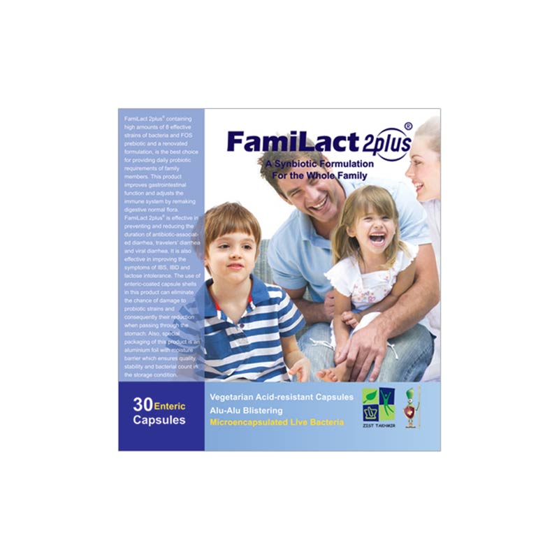 کپسول گوارش فمی لاکت توپلاس زیست تخمیر - 30 عددی (Zist Takhmir Familact 2plus Capsules 30 Caps) یک مکمل رژیمی غذایی محسوب می شود که با بهره گیری از فرمولاسیونی جدید و به کارگیری مقادیر بالایی از ۸ سویه باکتری مفید ، گزینهای فوقالعاده مناسب جهت تامین پروبیوتیک بدن به حساب می آید. این محصول مناسب استفاده برای نوجوانان و بزرگسالان می باشد. این فرآورده با بازسازی کردن فلور نرمال گوارشی باعث بهبود عملکرد دستگاه گوارش و تعدیل در سیستم ایمنی بدن میشود. این کپسول در پیشگیری و بهبود علائم سندورم روده تحریک پذیر و همچنین بیماریهای التهابی روده و عدم تحمل لاکتوز نیز موثر است.